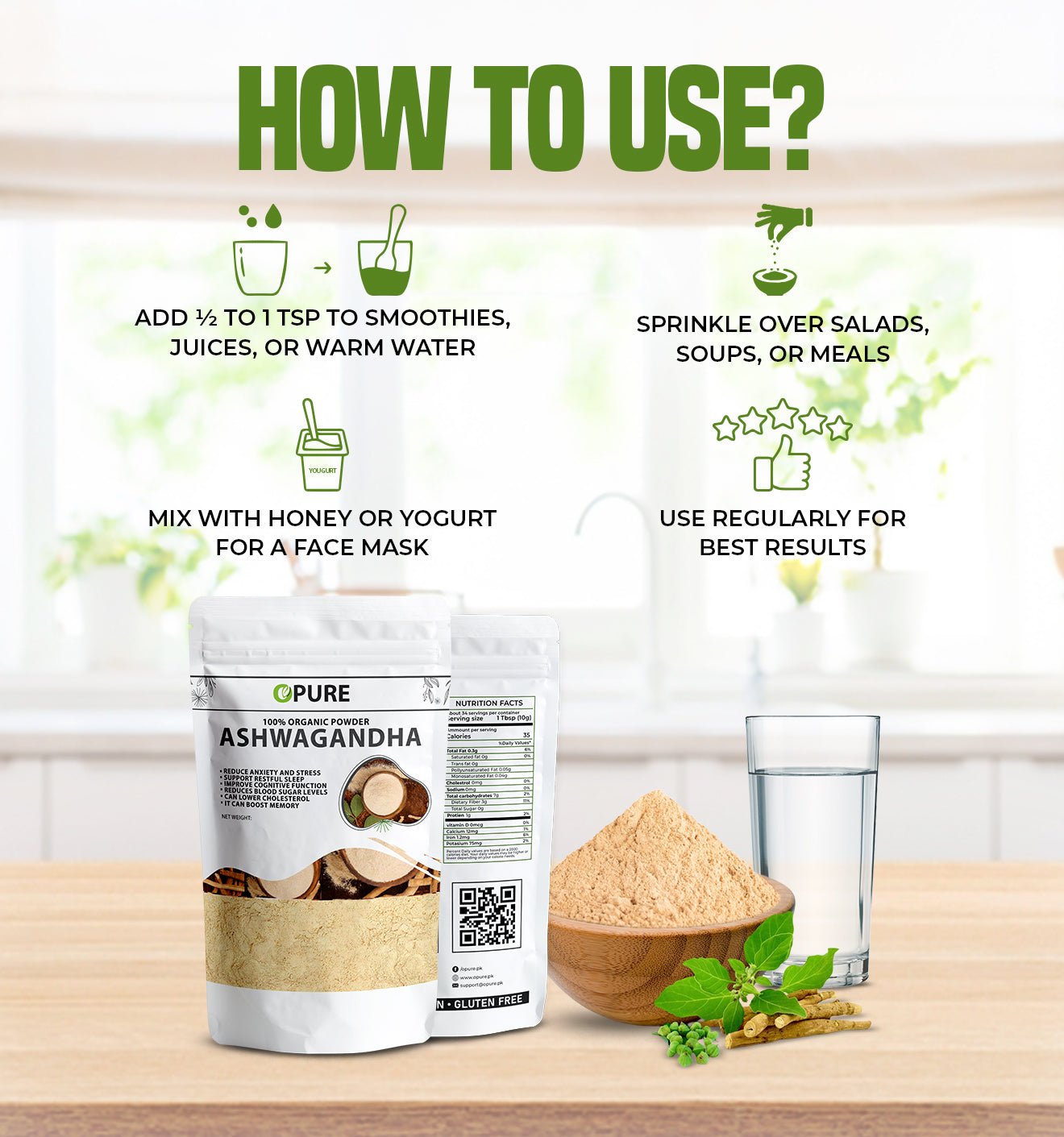 Take 1 teaspoon daily with milk, warm water, or smoothies. Regular use may help reduce stress, improve sleep quality, and increase energy levels.